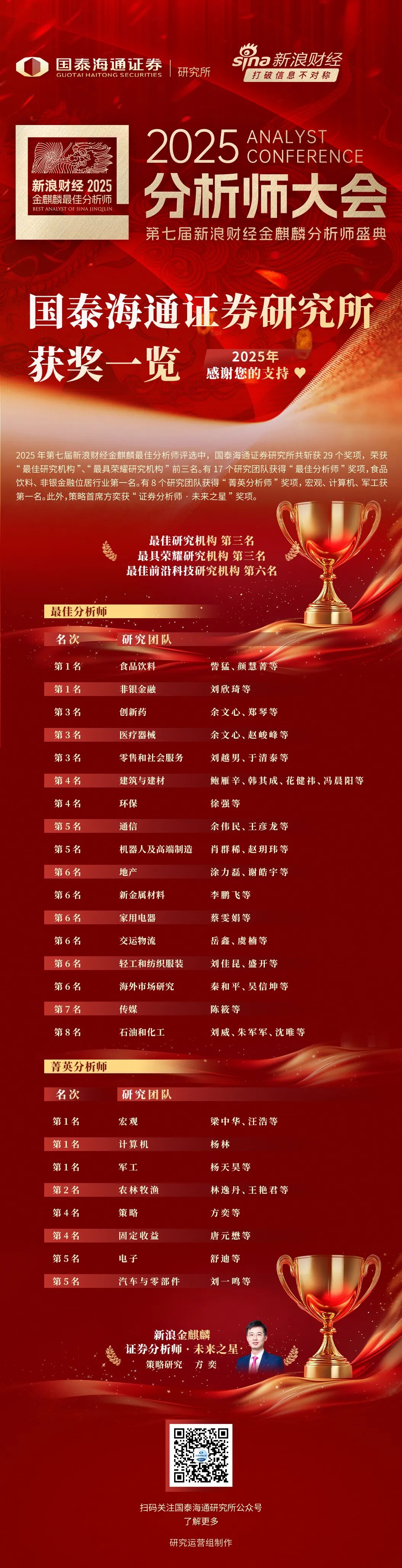 2025 年第七届新浪财经金麒麟最佳分析师评选中,国泰海通证券研究所共斩获 29 个奖项,荣获“最佳研究机构”、“最具荣耀研究机构”前三名。有 17 个研究团队获得“最佳分析师”奖项,食品饮料、非银金融位居行业第一名。有 8 个研究团队获得“菁英分析师”奖项,宏观、计算机、军工获第一名。此外,策略首席方奕获“证券分析师·未来之星”奖项。获奖详情如下:
