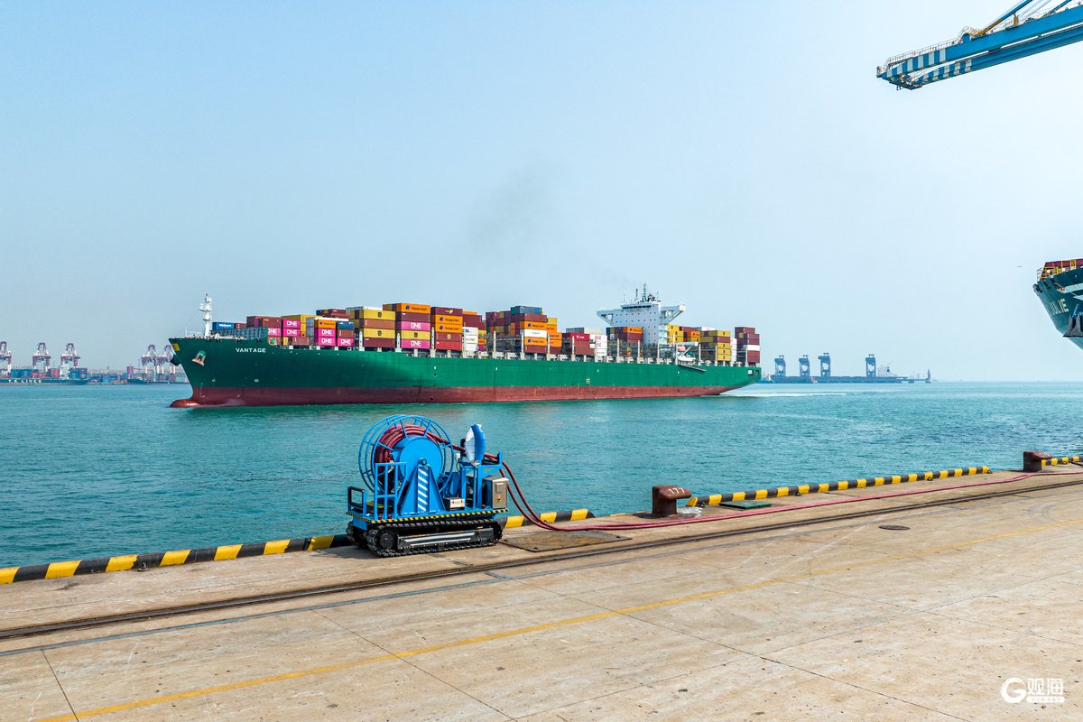 这背后,是青岛港集装箱领域的全链条、多层次绿色发展布局。在战略规划上,青岛港推行集装箱一体化运营模式,高点站位、系统制定绿色低碳转型规划方案,发布“碳中和”港口评价标准,推动三大核心作业码头绿色标准统一、技术共享;在能源转型上,全力推进集装箱作业区清洁能源替代,规模化投用氢动力轨道吊、电动牵引车等新能源装备,建成全国港口首座加氢站,全面升级岸电设施,岸电接电屡创新高,实现了高效运营与节能减排“双向提升”。