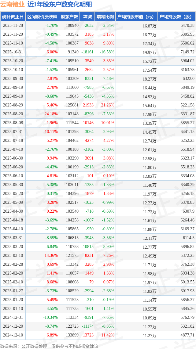 从股价来看,2025年11月20日至2025年11月28日,云南锗业区间跌幅为1.7%,在此期间股东户数减少2632.0户,减幅为2.54%。