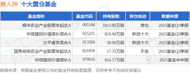 根据2025基金Q3季报公募基金重仓股数据,重仓该股的公募基金共4家,其中持有数量最多的公募基金为银华基金的银华农业产业股票发起式A。银华农业产业股票发起式A目前规模为4.36亿元,最新净值1.2759(12月3日),较上一交易日下跌0.78%,近一年下跌6.04%。该公募基金现任基金经理为唐能。唐能在任的基金产品包括:银华和谐主题混合,管理时间为2015年5月25日至今,期间收益率为27.11%;银华瑞泰灵活配置混合,管理时间为2018年12月27日至今,期间收益率为103.26%;银华科创主题灵活配置混合(LOF),管理时间为2019年7月5日至今,期间收益率为79.73%;银华科技创新混合A,管理时间为2020年1月16日至今,期间收益率为45.25%。