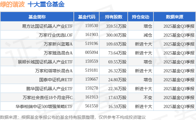 根据2025基金Q3季报公募基金重仓股数据,重仓该股的公募基金共29家,其中持有数量最多的公募基金为易方达基金的易方达国证机器人产业ETF。易方达国证机器人产业ETF目前规模为133.15亿元,最新净值1.4083(12月3日),较上一交易日下跌0.73%,近一年上涨17.18%。该公募基金现任基金经理为李栩 李树建。李栩在任的基金产品包括:易方达中证物联网主题ETF,管理时间为2022年11月26日至今,期间收益率为66.01%;易方达中证港股通互联网ETF,管理时间为2023年5月31日至今,期间收益率为46.24%;易方达中证2000ETF,管理时间为2023年9月13日至今,期间收益率为51.41%;易方达中证生物科技主题ETF发起式联接A,管理时间为2023年9月19日至今,期间收益率为-2.46%。李树建在任的基金产品包括:易方达创业板中盘200ETF,管理时间为2023年12月15日至今,期间收益率为41.06%;易方达上证科创板成长ETF联接发起式A,管理时间为2024年1月4日至今,期间收益率为96.59%;易方达信创ETF联接A,管理时间为2024年1月5日至今,期间收益率为76.65%;易方达机器人ETF联接A,管理时间为2024年5月21日至今,期间收益率为38.26%。