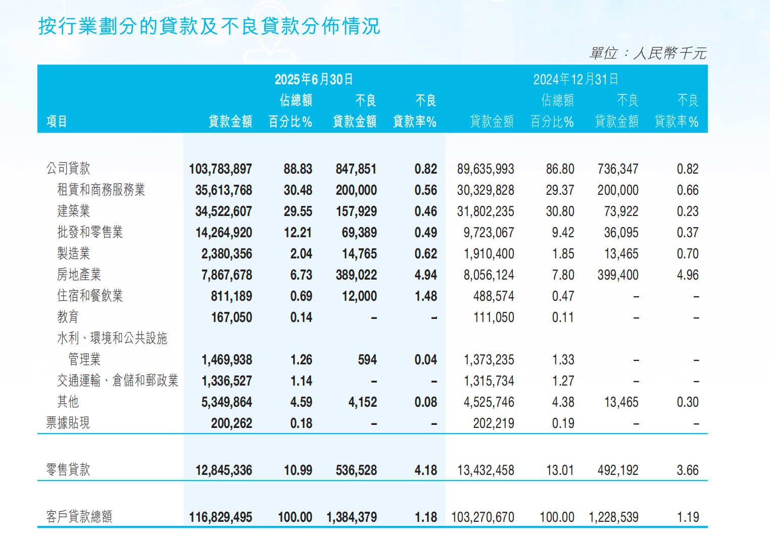 拆解泸州银行的不良贷款构成,主要集中在包括房地产业、租赁和商务服务业、建筑业三大领域,合计占公司类不良贷款总额的88.10%。其中,房地产业不良贷款率最高,达到4.94%。