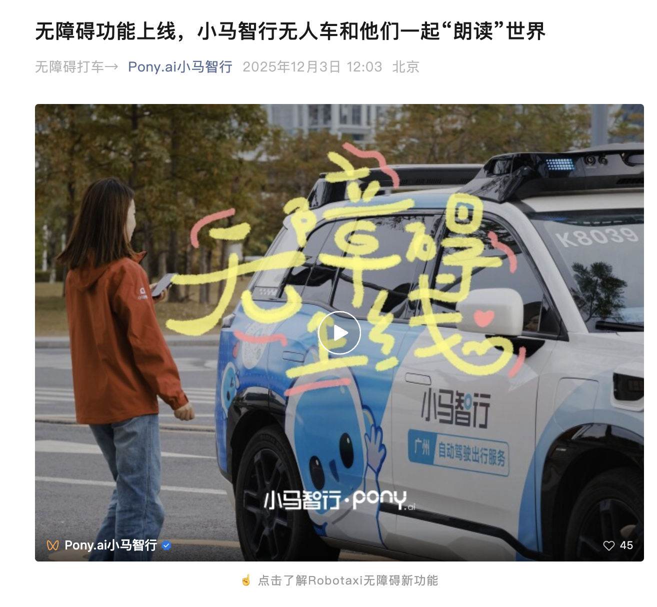 凤凰网科技讯 12月3日,小马智行正式上线无障碍功能,后续将覆盖所有自动驾驶车型。