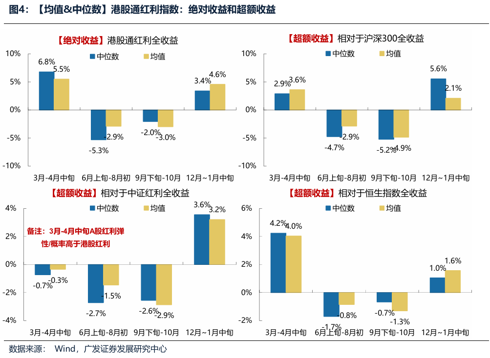 (1)【上涨】概率较大/幅度较高:3月-4月中旬,可能是年报高峰,超预期的分红方案导致的上涨,但弹性以及上涨概率不如A股红利。