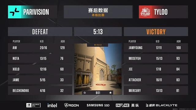 TYLOO 首战面对的是 PARIVISION,在荒漠迷城 (mirage) 上以 13:5 轻取对手。不过在与 NIP 的核子危机 (nuke)、与 M80 的列车停放站 (train) 中,TYLOO 尽管都创造了不错的开局,但最终分别以 8:13、10:13 负于对手。