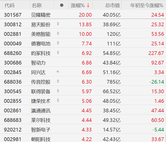 12月1日,A股市场消费电子板块走强,其中,贝隆精密20CM涨停,易天股份涨超13%,美格智能10CM涨停,德赛电池涨超7%,昀家科技、智动力、同兴达、传音控股涨超6%,联得装备、捷荣技术涨超5%。消息面上,XREAL与谷歌合作,将于12月(时间待定)发布AR眼镜Project Aura。