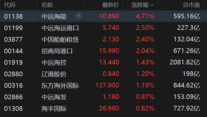 12月1日,港股港口及海运股普遍上涨,其中,中远海能涨超5%,中远海运港口、中国船舶租赁涨2.5%,招商局港口、中远海控、东方海外国际、中远海发、海丰国际跟涨。