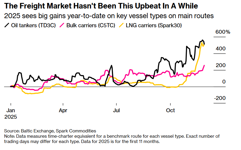 智通财经APP获悉,从能源到大宗矿石等大宗商品的全球海运费率,正走向一次极为罕见的年末飙升,持续上演的地缘政治冲突、西方国家制裁举措以及不断攀升的产量正在颠覆全球海运供应线路。当前出现的年末运费暴涨凸显出需求端并未如期“冬眠”,反而被AI基础设施+能源+大宗复苏顶着往上冲,而供给端则被地缘冲突和制裁“人为缩水”,有效运力被拉长、被锁死,在短期运力基本固定的行业里,最终的结果就是——价钱突然间爆到天花板。