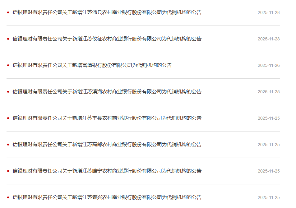 11月下旬以来,信银理财集中披露多则新增理财产品代销机构公告,合作对象涵盖江苏沛县农村商业银行、江苏仪征农村商业银行、江苏滨海农村商业银行、江苏丰县农村商业银行等共计8家地方性中小银行,其中,江苏省成为其下沉市场拓展的核心区域。