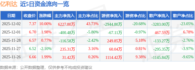 证券之星12月3日盘中消息,10点43分亿利达(002686)触及涨停板。其所属行业通用设备目前下跌。领涨股为四方达。该股为冷链,债转股 · AMC,浙江国企改革概念热股。