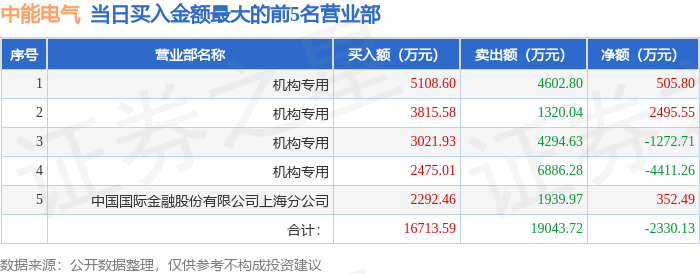 证券之星消息,沪深交易所2025年12月8日公布的交易公开信息显示,中能电气(300062)因日换手率达到30%的前5只证券登上龙虎榜。此次是近5个交易日内第2次上榜。