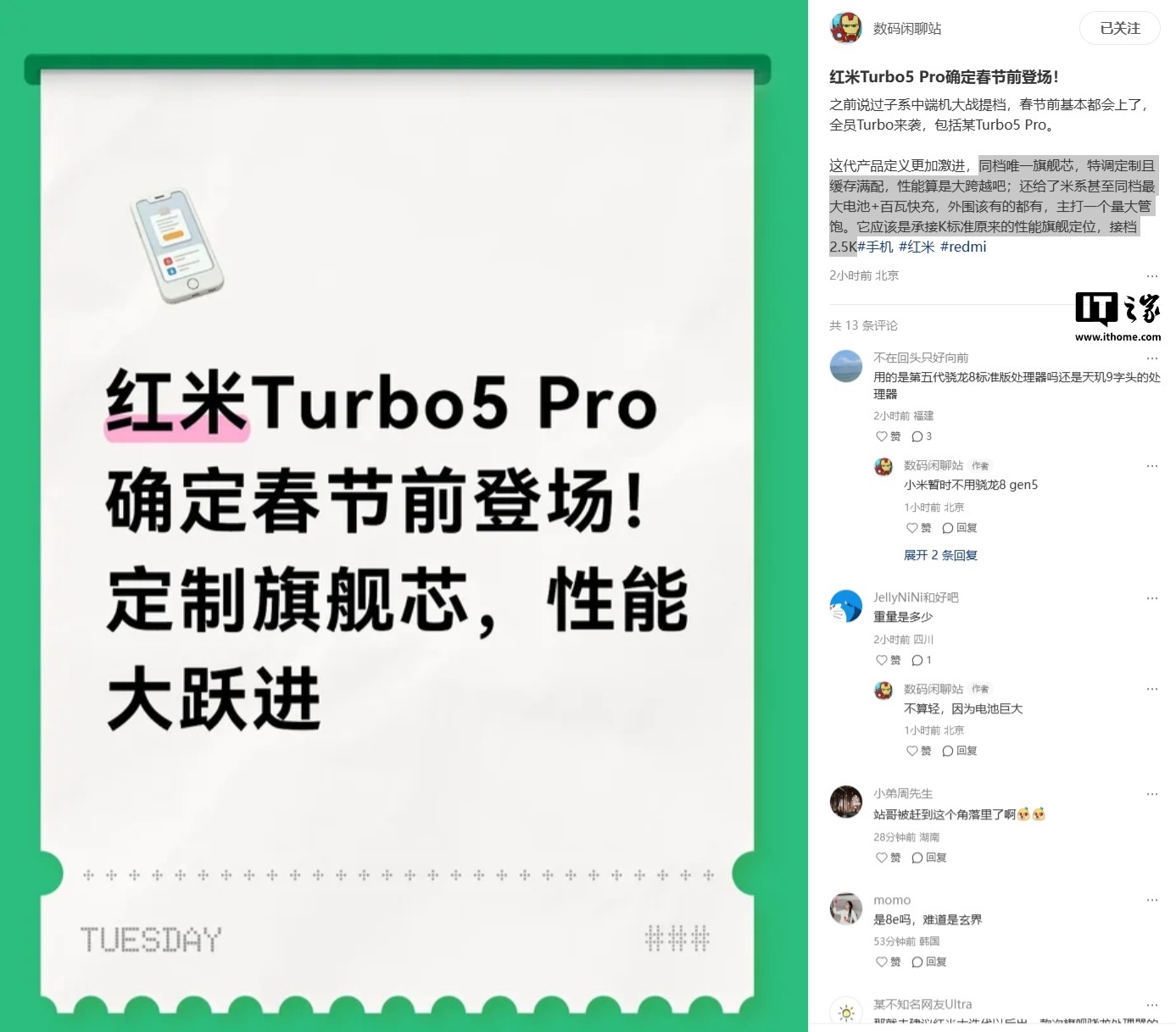 据IT之家此前援引博主 @数码闲聊站 消息,小米 REDMI Turbo5 Pro 手机将在春节前登场,产品定义更加激进,搭载同档唯一旗舰芯,特调定制且缓存满配,性能算是“大跨越”。
