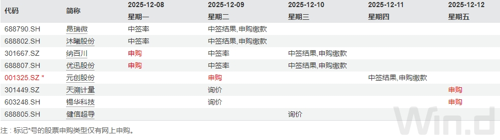 Wind数据显示,本周将有5只新股发行,其中沪市主板1只、科创板1只、深市主板1只、创业板2只。具体来看,12月8日发行的是优迅股份、纳百川;12月9日发行的是元创股份;12月12日发行的是锡华科技、天溯计量。