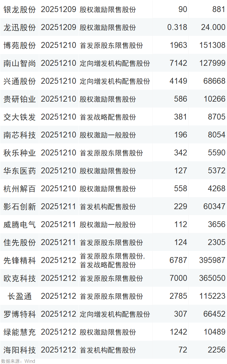 本周限售股解禁一览: