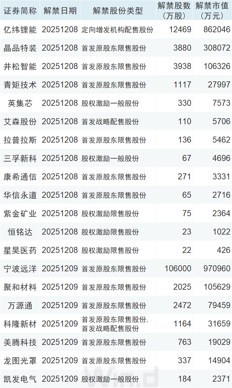 从解禁市值来看,12月8日是解禁高峰期,13家公司解禁市值合计133.77亿元,占本周解禁规模的33.65%。按12月5日收盘价计算,解禁市值居前三位的是:宁波远洋(97.1亿元)、亿纬锂能(86.2亿元)、先锋精科(39.6亿元)。从个股的解禁量看,解禁股数居前三位的是:宁波远洋(10.6亿股)、亿纬锂能(1.25亿股)、南山智尚(0.71亿股)。