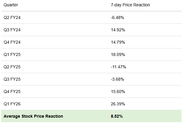 鉴于分析师对营收增速的预期已高于公司指引的上限,加之数据中心建设仍受供应链瓶颈制约,市场对公司能否实现大幅营收跃升持谨慎态度,尽管上季度剩余履约义务(RPO)创下纪录。不过,当前市场似乎更看重其云基础设施业务的表现和 RPO 的增长,过去几个季度这两项指标均相当亮眼;因此,财报发布后七天内股价平均上涨 8.52%。