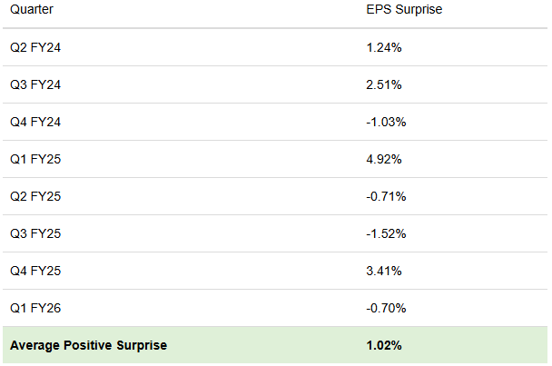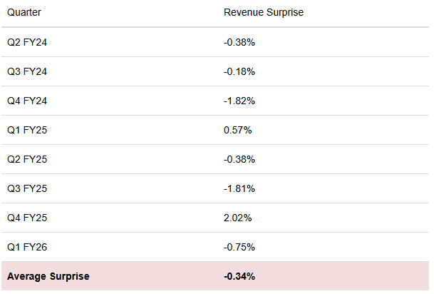 然而,从历史记录来看,甲骨文在过去八个季度中仅两次实现营收超预期,平均而言比市场预期低 0.34%;每股收益方面表现稍好,胜率约为一半,但由于超预期的幅度显著大于未达预期的幅度,整体平均仍实现 1.02% 的正向惊喜。