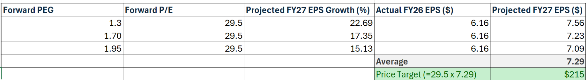 估值方面,据数据显示,甲骨文当前前瞻市盈率约为 29.5 倍,显著低于此前的 35.5 倍,但仍高于过去五年平均的 21.3 倍。在第一季度财报后运用自回归整合移动平均(ARIMA)模型预测,该公司 2026 财年每股收益为 6.16 美元;目前股票前瞻市盈率相对盈利增长比率(PEG)为 1.3,低于行业中位值 1.70 及公司五年均值 1.95。基于不同 PEG 情景测算,2027 财年平均每股收益为 7.29 美元,按 29.5 倍市盈率计算,目标价约为 215 美元,这意味着当前水平上行空间有限。