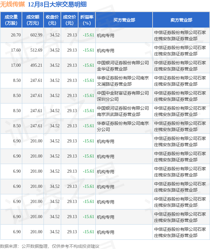 证券之星消息,12月8日无线传媒发生大宗交易,交易数据如下: