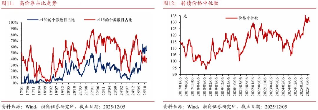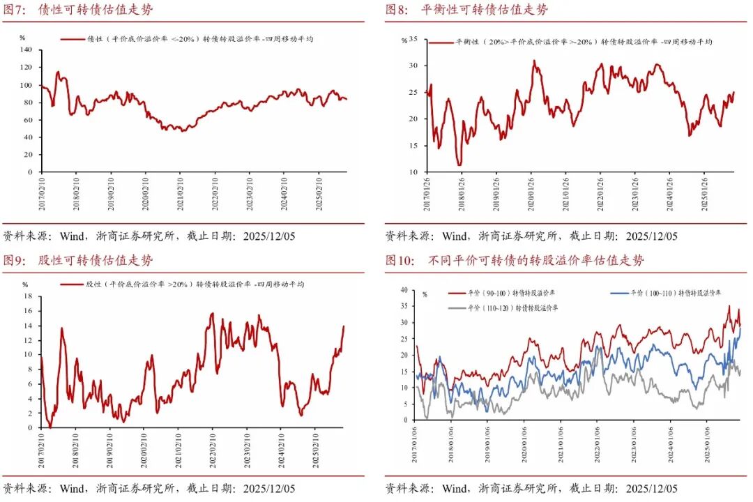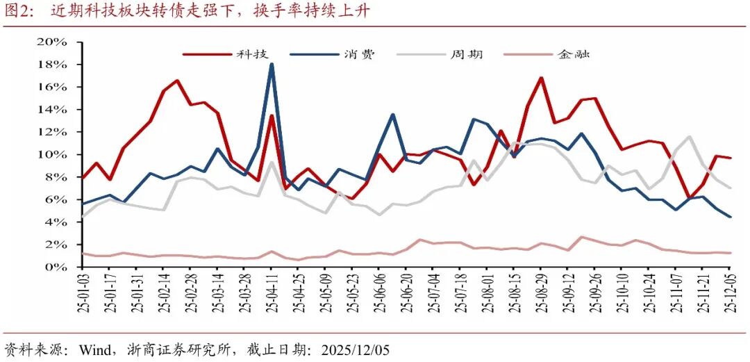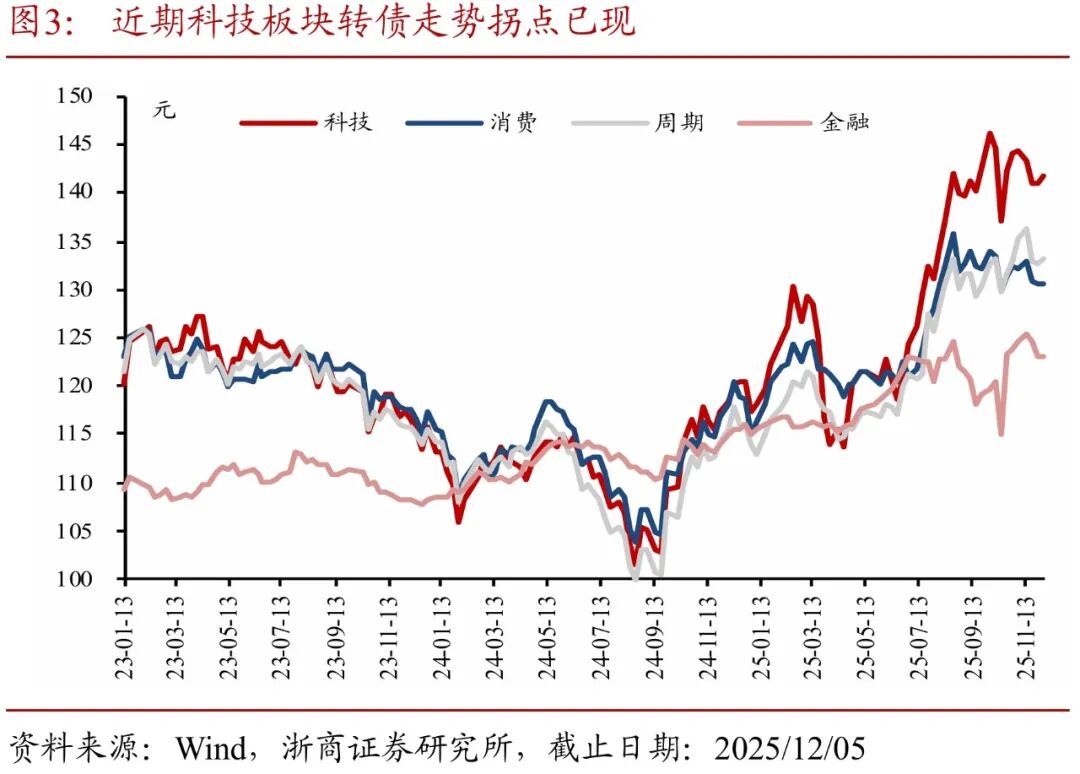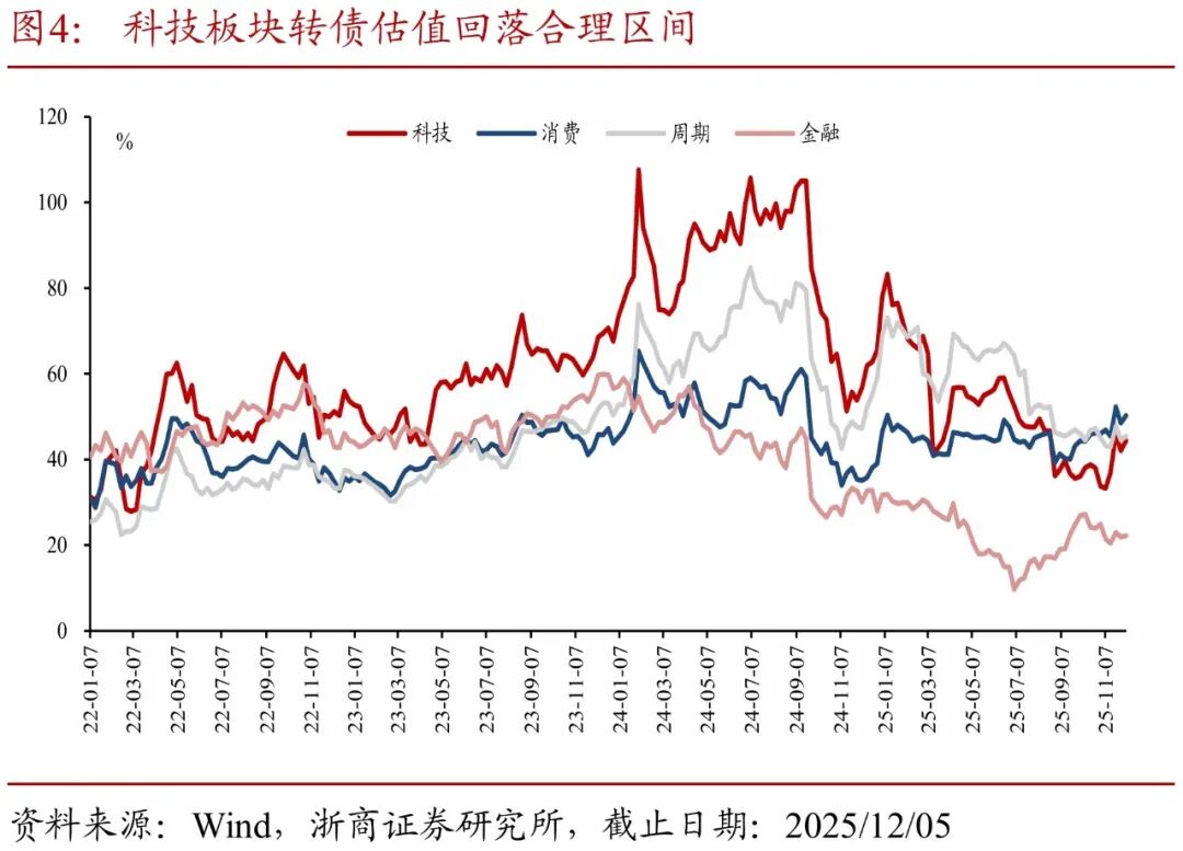 3. 风格维度,哑铃策略下投资者可重点关注科技成长板块的配置价值。根据浙商固收转债量化模型最新测算,截至2025/12/4价值风格表现最好,该风格下重点标的近一周收益率均值为+0.42%,为各风格中表现最优且整体为正收益,市场呈现“高溢价高波动承压、低估值标的结构性占优”的格局。年关将至价值风格有望短期占优;同时近期强赎事件频发,股性个券溢价率局部压缩。展望后市,在投资者已完成明显止盈和近期持续的强赎事件影响,科技板块溢价率已有一定压缩,近期回落至44%,价格和估值已逐步回归合理区间,随着科技板块的基本面趋势不改,盈利、风险偏好和流动性有望进一步形成共振,科技板块配置价值显著。