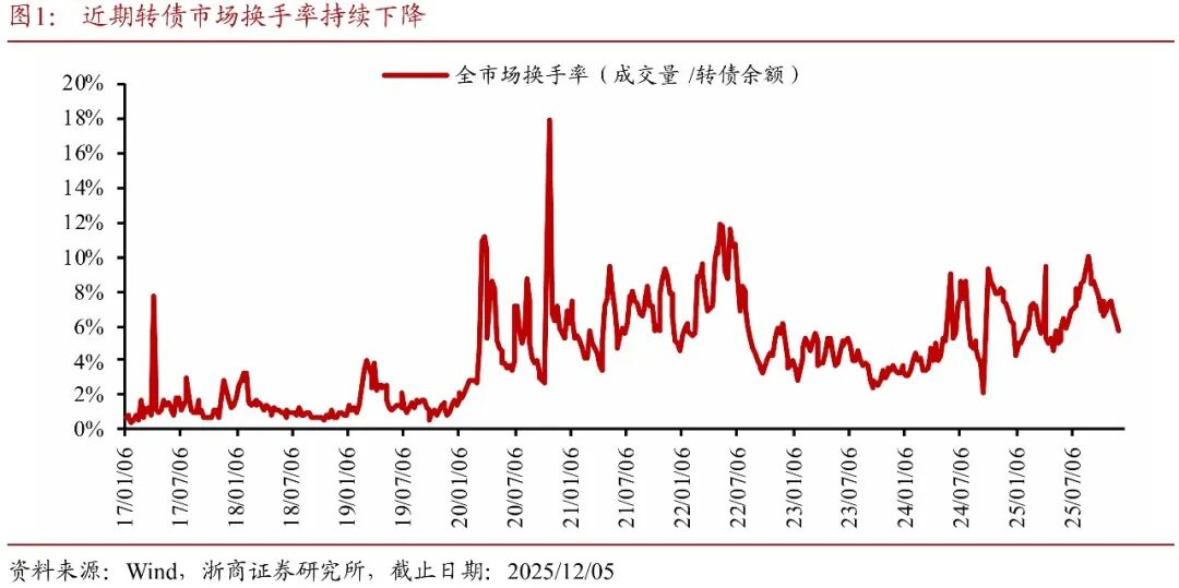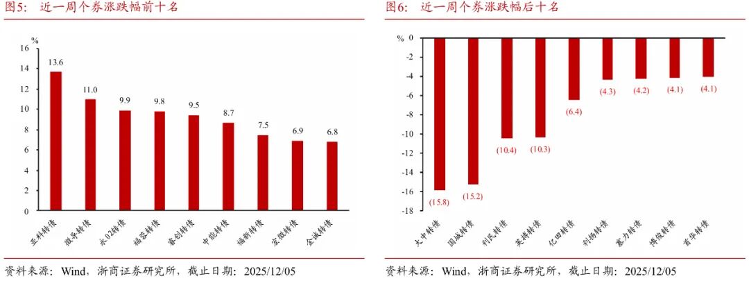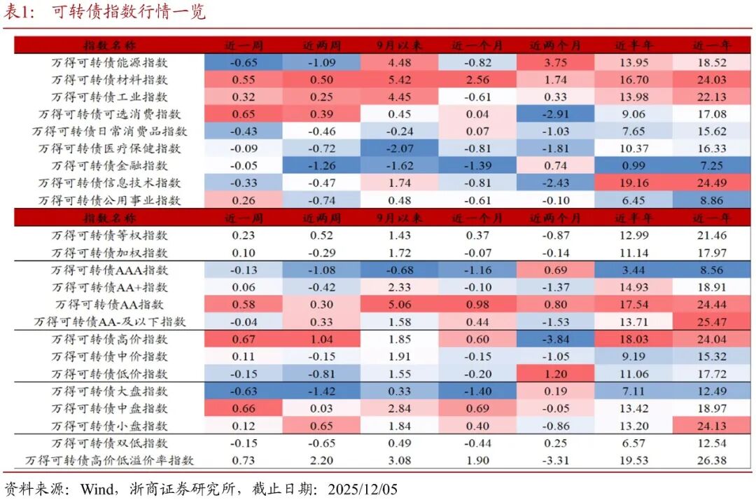 本周(2025/12/01~2025/12/05,下同)转债市场走势先下后上,整体呈现成交缩量、区间震荡,估值压缩。行业维度,可选消费(+0.65%)、材料(+0.55%)、工业(+0.32%)等板块走强,能源(-0.65%)和日常消费(-0.43%)板块走弱。近期在债券市场的持续调整下,纯债基金的赎回规模明显放大,市场流动性收缩明显,带动固收+基金赎回规模同步扩大,但转债市场通过估值波动熨平债券市场震荡影响,总体持仓体验更优。中期维度,虽然转债供给持续缩量,但市场增量资金充足,预计转债估值回调空间有限,同时随着投资者止盈预期接近尾声,权益慢牛预期下市场对于高估值的标的容忍度有所提升。