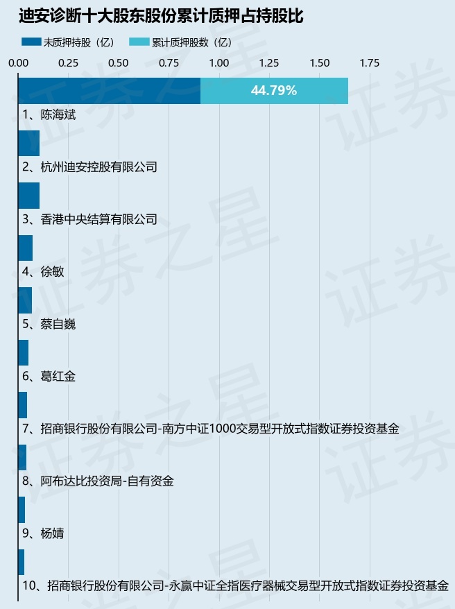 截止本公告日,股东陈海斌已累计质押股份7366.0万股,占其持股总数的44.79%。本次质押后迪安诊断十大股东的累计质押股份占持股比例(占持股比例的计算以公司最新一期财务报表公布的十大股东的持股总数为基准)见下图: