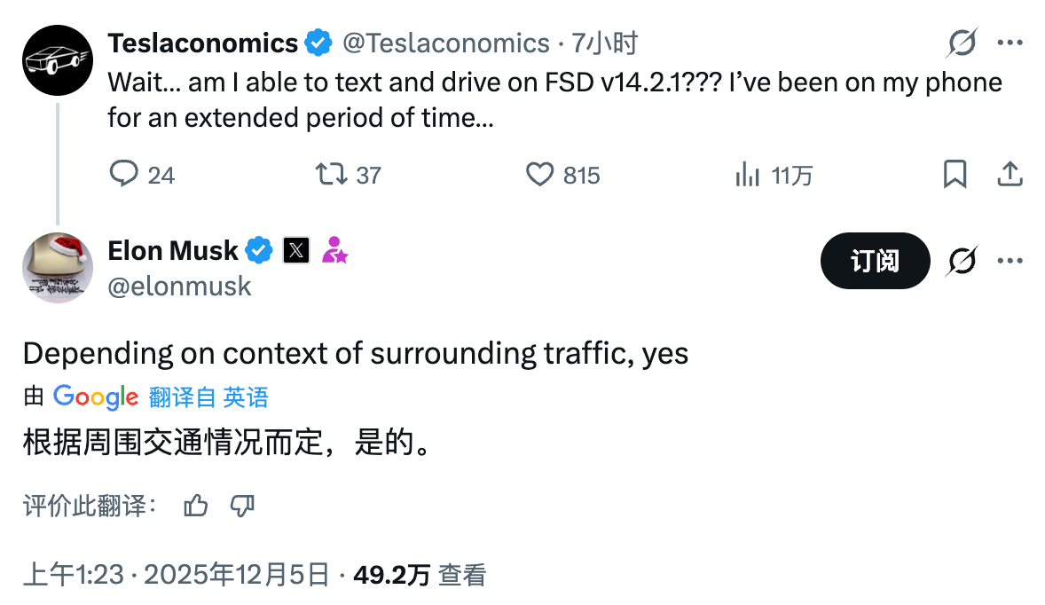 有网友在X上提问称,FSD v14.2.1版本是否允许边开车边发短信?马斯克对此回应称,“是的,具体要视周围交通状况而定”。
