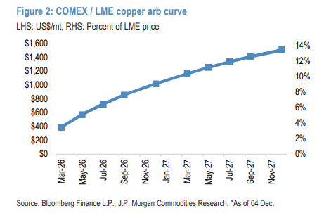数据显示,美国市场的铜价持续维持高额溢价。尽管LME价格近期走高,但美国商品交易所(COMEX)与LME之间的价差依旧显著。例如,2026年3月到期的COMEX铜合约价格比LME相应合约高出约390美元/吨。