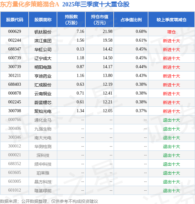 东方量化多策略混合A的前十大重仓股如下: