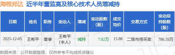证券之星消息,根据12月8日市场公开信息、上市公司公告及交易所披露数据整理,海程邦达(603836)最新董监高及相关人员股份变动情况:2025年12月5日公司董事王希平共减持公司股份7.02万股,占公司总股本为0.0342%。变动期间公司股价下跌2.73%,12月5日当日收盘报14.59元。