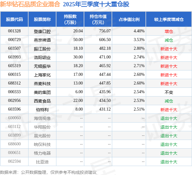 新华钻石品质企业混合的前十大重仓股如下: