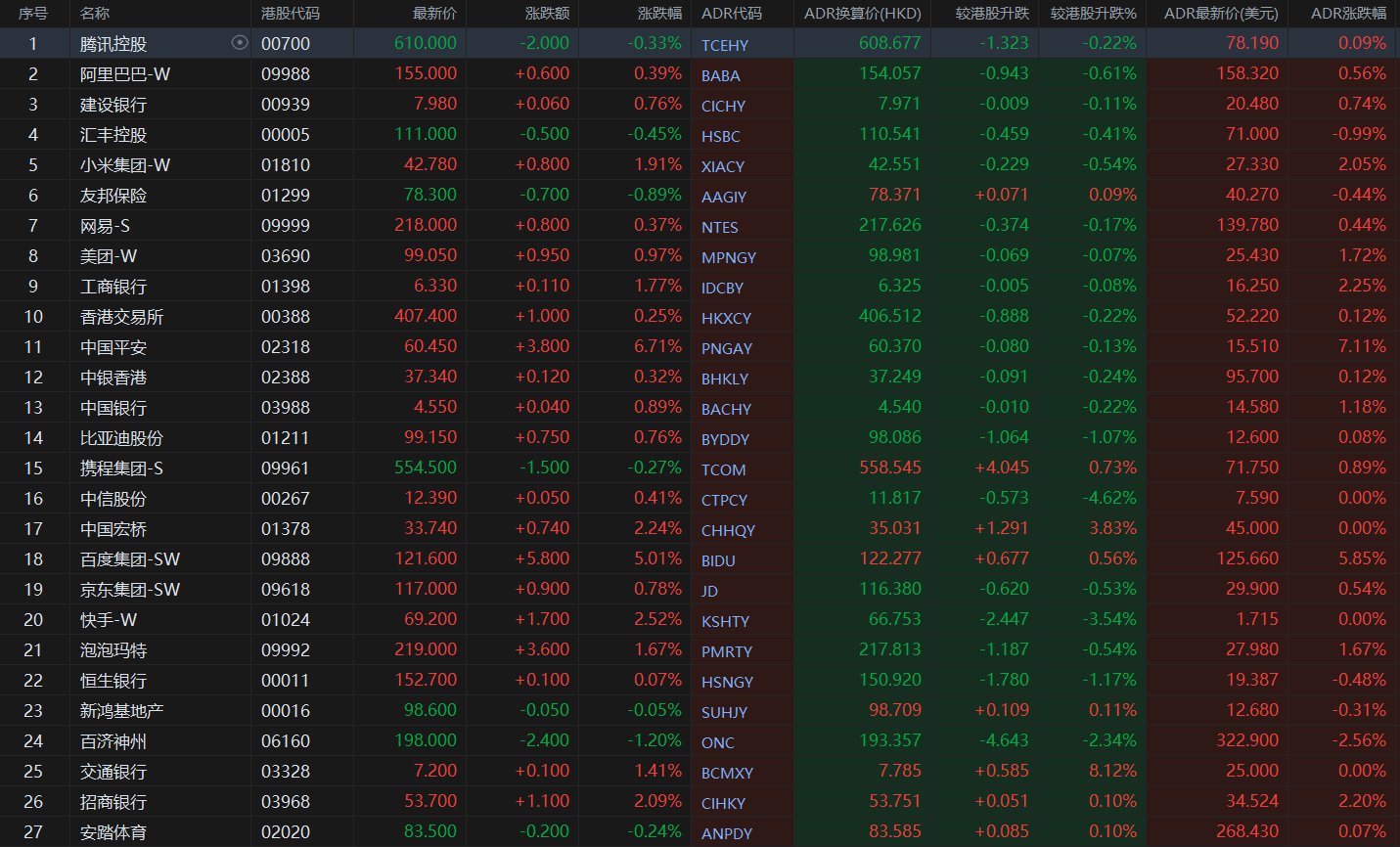 大型蓝筹股多数下跌,汇丰控股收报110.541港元,较香港收市跌0.41%;腾讯控股收报608.677港元,较香港收市跌0.22%。