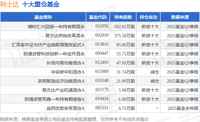 根据2025基金Q3季报公募基金重仓股数据,重仓该股的公募基金共9家,其中持有数量最多的公募基金为博时基金的博时汇兴回报一年持有期混合。博时汇兴回报一年持有期混合目前规模为58.18亿元,最新净值0.978(12月4日),较上一交易日上涨0.3%,近一年上涨39.26%。该公募基金现任基金经理为吴渭。吴渭在任的基金产品包括:博时汇智回报灵活配置混合,管理时间为2017年4月12日至今,期间收益率为190.23%;博时汇荣回报混合A,管理时间为2021年8月24日至今,期间收益率为14.33%。