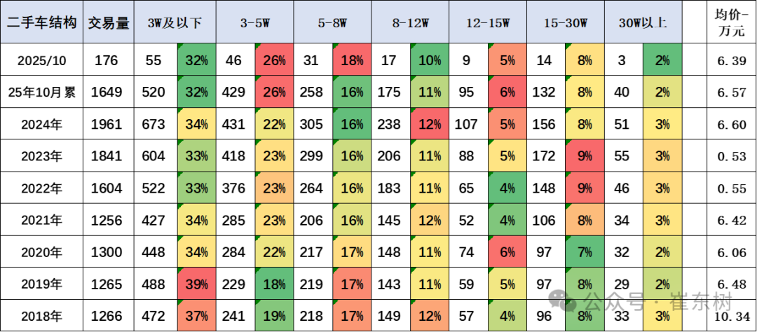 二手车的次新车交易表现较强,主要也是新能源车成为二手车的组成。二手车的交易结构目前来看:高车龄的二手车逐步增多,2025年1-10月总体占比达到11.4%的比例,而3-6年达到44.1%的比例,增长比较突出,两者比例都是相对较高的。
