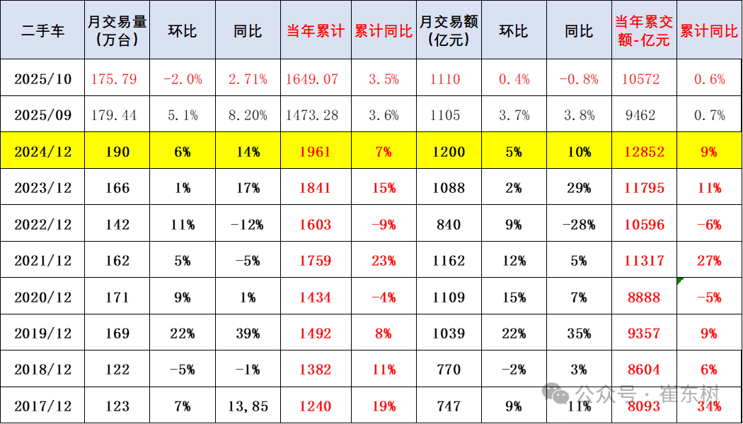 2023-2024年的二手车交易较活跃,实现了较强的增长。受春节因素,2025年上半年的二手车交易较弱,6-9月逐步回暖,10月二手车的走势较弱。