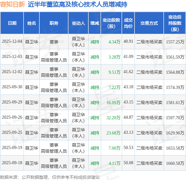 证券之星消息,根据12月5日市场公开信息、上市公司公告及交易所披露数据整理,容知日新(688768)最新董监高及相关人员股份变动情况:2025年12月3日至2025年12月4日公司董事聂卫华、董事,高级管理人员聂卫华共减持公司股份7.62万股,占公司总股本为0.0866%。变动期间公司股价下跌1.47%,12月4日当日收盘报40.82元。