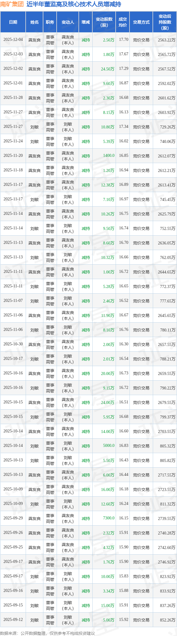南矿集团近半年内的董监高及核心技术人员增减持详情如下: