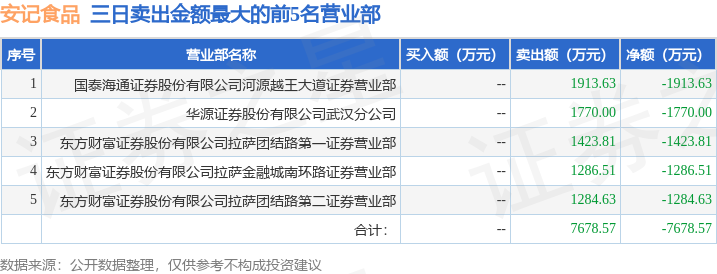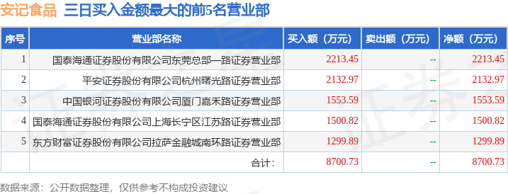 证券之星消息,沪深交易所2025年12月5日公布的交易公开信息显示,安记食品(603696)因非ST、*ST和S证券连续三个交易日内收盘价格涨幅偏离值累计达到20%的证券登上龙虎榜。此次是近5个交易日内第2次上榜。