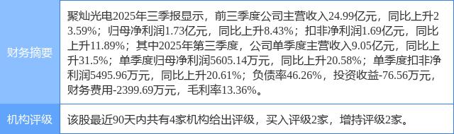 2025年10月27日,中国银河研究员高峰发布了对聚灿光电的研报《聚灿光电2025年三季报点评:产品类型持续丰富,精细管理降本增效》,该研报对聚灿光电给出“买入”评级。证券之星数据中心根据近三年发布的研报数据计算,该研报作者对此股的盈利预测准确度为42.13%。