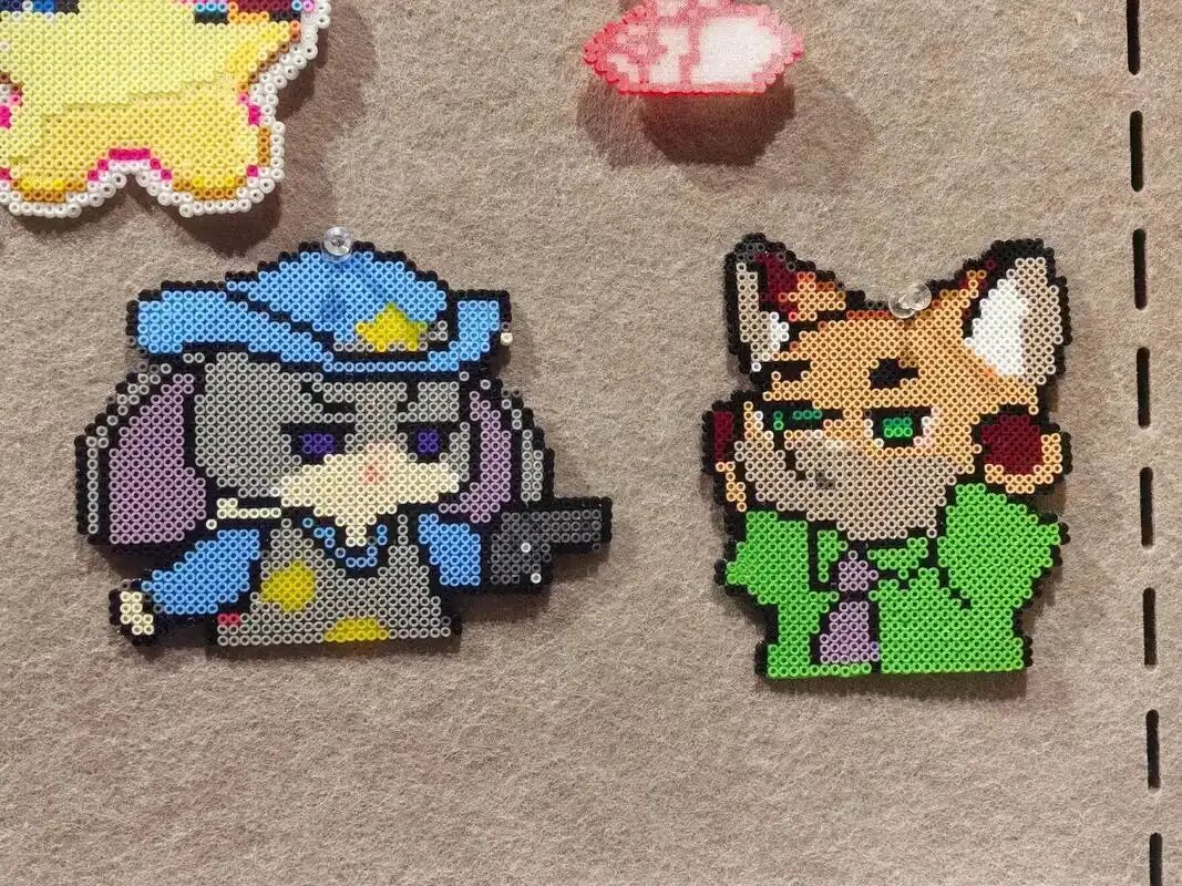 社交平台上,IP爱好者们争相将兔朱迪与狐尼克制作成像素风格的拼豆作品;线下手作店里,年轻人们则用一两个小时,专注地将对狐兔CP的喜爱倾注进一粒粒豆子中,制成专属摆件、创意票根。