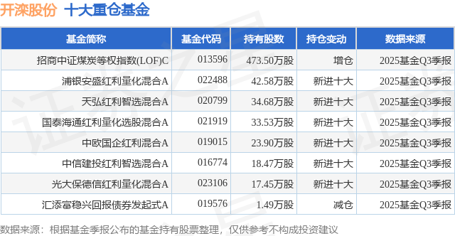 根据2025基金Q3季报公募基金重仓股数据,重仓该股的公募基金共8家,其中持有数量最多的公募基金为招商基金的招商中证煤炭等权指数(LOF)C。招商中证煤炭等权指数(LOF)C目前规模为2.42亿元,最新净值2.0366(12月8日),较上一交易日下跌1.3%,近一年上涨1.38%。该公募基金现任基金经理为邓童 窦福成。邓童在任的基金产品包括:招商中证500指数增强A,管理时间为2021年11月23日至今,期间收益率为20.79%;招商大宗商品(LOF),管理时间为2021年12月2日至今,期间收益率为25.64%;招商北证50成分指数发起式A,管理时间为2022年12月22日至今,期间收益率为47.97%。窦福成在任的基金产品包括:招商中证全指红利质量ETF,管理时间为2025年11月13日至今,期间收益率为-1.11%;招商中证A100ETF,管理时间为2025年11月13日至今,期间收益率为-0.63%;招商中证物联网主题ETF,管理时间为2025年11月13日至今,期间收益率为1.47%。