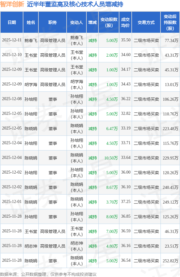智洋创新近半年内的董监高及核心技术人员增减持详情如下: