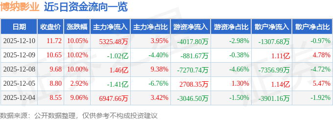 12月10日的资金流向数据方面,主力资金净流入5325.48万元,占总成交额3.95%,游资资金净流出4017.8万元,占总成交额2.98%,散户资金净流出1307.68万元,占总成交额0.97%。