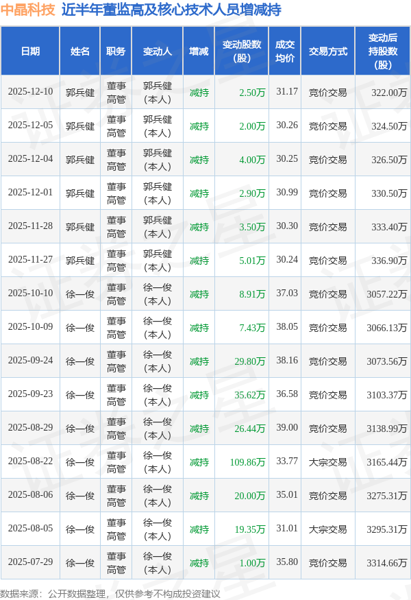 中晶科技近半年内的董监高及核心技术人员增减持详情如下: