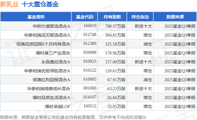 根据2025基金Q3季报公募基金重仓股数据,重仓该股的公募基金共20家,其中持有数量最多的公募基金为中欧基金的中欧价值智选混合A。中欧价值智选混合A目前规模为34.68亿元,最新净值5.3558(12月11日),较上一交易日下跌0.63%,近一年上涨31.65%。该公募基金现任基金经理为袁维德。袁维德在任的基金产品包括:中欧睿泓定开混合,管理时间为2018年3月28日至今,期间收益率为156.72%;中欧新兴价值一年持有混合A,管理时间为2021年9月6日至今,期间收益率为9.61%;中欧多元价值三年持有混合A,管理时间为2022年1月26日至今,期间收益率为11.8%。