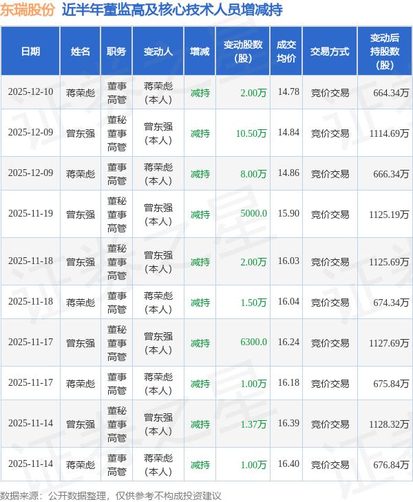 东瑞股份近半年内的董监高及核心技术人员增减持详情如下: