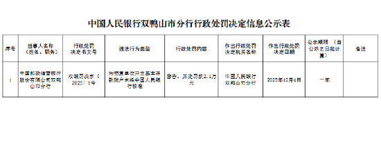 12月11日金融一线消息,中国人民银行双鸭山市分行行政处罚决定信息公示表显示,中国邮政储蓄银行股份有限公司双鸭山市分行因为预算单位开立基本存款账户未经中国人民银行核准,受到警告,并被罚款2.1万元。 海量资讯、精准解读,尽在新浪财经APP 责任编辑:曹睿潼