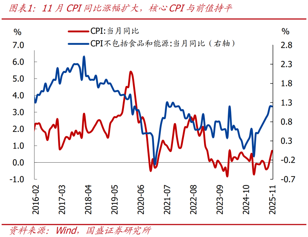 事件:2025年11月CPI同比0.7%,预期0.7%,前值0.2%;核心CPI同比1.2%,前值1.2%;PPI同比-2.2%,预期-2.0%,前值-2.1%。