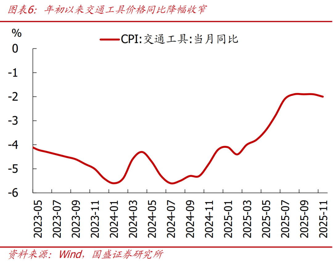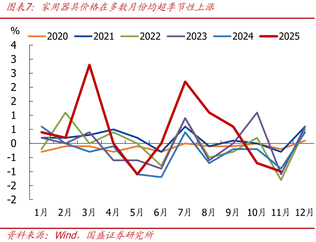 >可选消费品:主要包括交通工具、家用器具、通信工具、文娱耐用消费品(电视、电脑等)、服装、其他用品(首饰等)。其中,1)家电、汽车:2025年家用器具、交通工具价格在多数月份均超季节性上涨,与以旧换新政策刺激下的消费增长有关;年初以来交通工具同比降幅明显收窄,8月以来家用器具同比涨幅保持在4%以上;2)其他用品:受国际金价上涨影响,金饰品价格同比保持在30%以上,2025年金饰品和铂金饰品月均拉动CPI同比0.23个百分点,近两月月均拉动CPI同比0.4个百分点。