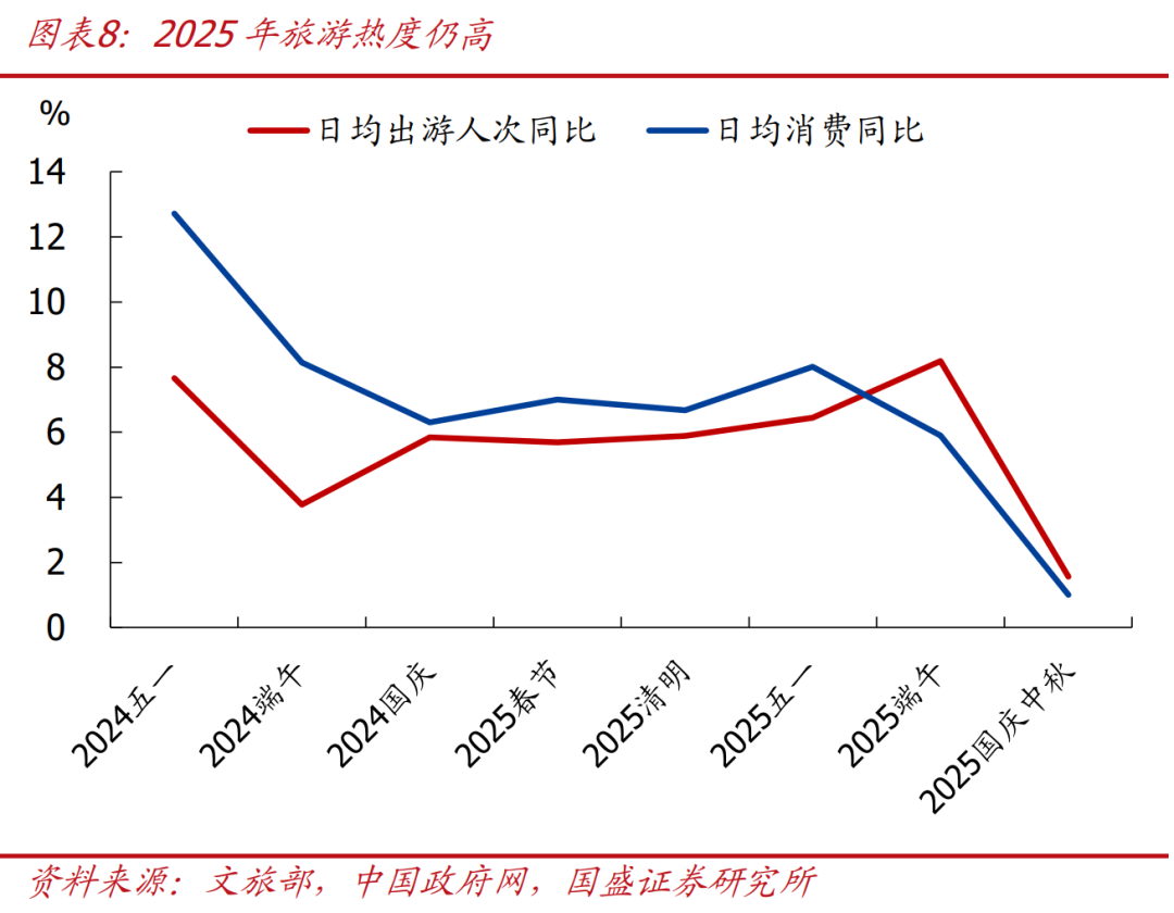 >可选服务:主要包括餐饮、旅游、交通费、文化和娱乐服务、其他服务(旅馆住宿、美容美发和洗浴)等。其中,1)旅游:2025年的主要假期月(春节、五一、端午、暑假、国庆中秋),旅游价格均超季节性上涨,主因今年旅游热度偏高,出游人次和总花费均创新高。2)交通费:近两月机票价格上涨至高位,10-11月机票价格同比分别上涨8.9%、7.0%。3)其他服务:2025年1-10月其他服务价格同比保持在1%-3.2%之间,10月宾馆住宿价格同比上涨2.8%,环比上涨8.6%,强于季节性水平。